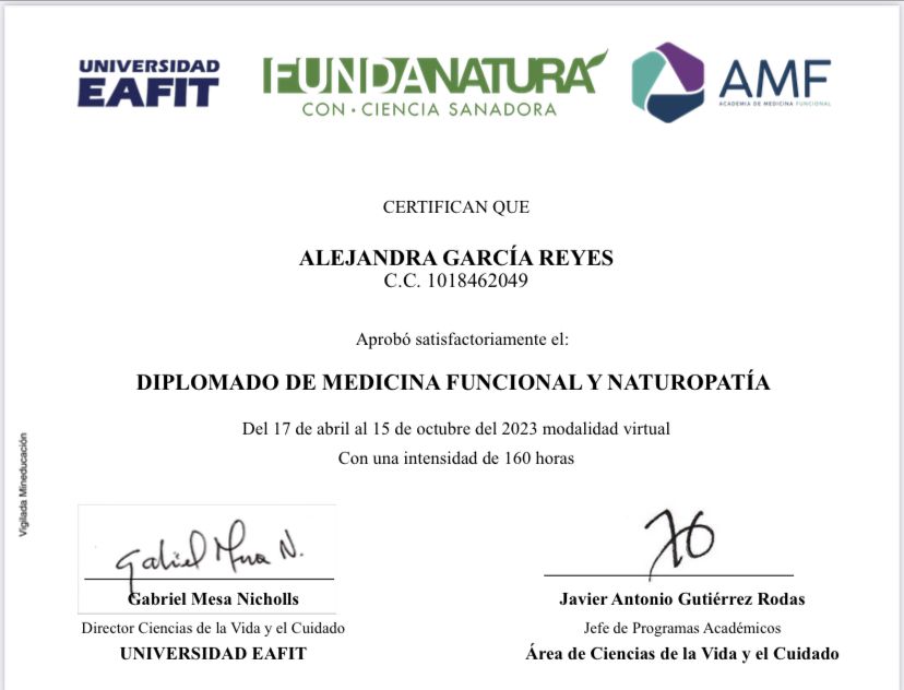 Soy médica cirujana, graduada de la Universidad El Bosque en Bogotá. Con formación en Medicina Funcional y Naturopatía por la Academia de Medicina Funcional y máster en Nutrición Clínica y Dietética Hospitalaria por la Universidad Camilo José Cela de Madrid, con más de 4 años de experiencia clínica.